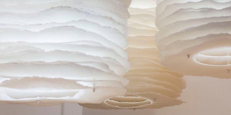 Et on termine notre sélection avec un autre designer français, Jean Luc Mare. Cet ancien graphiste publicitaire est tombé amoureux du papier, à tel point qu’il s’est mis à fabriquer des suspensions, des appliques et des lampes à poser à partir de ce matériau. Constituées de fines couches de papier, telles un millefeuilles, les luminaires de Jean Luc Mare à l’allure japonisante laissent passer une lumière douce, pour une ambiance élégante et raffinée, bref, tout ce qu’on aime!