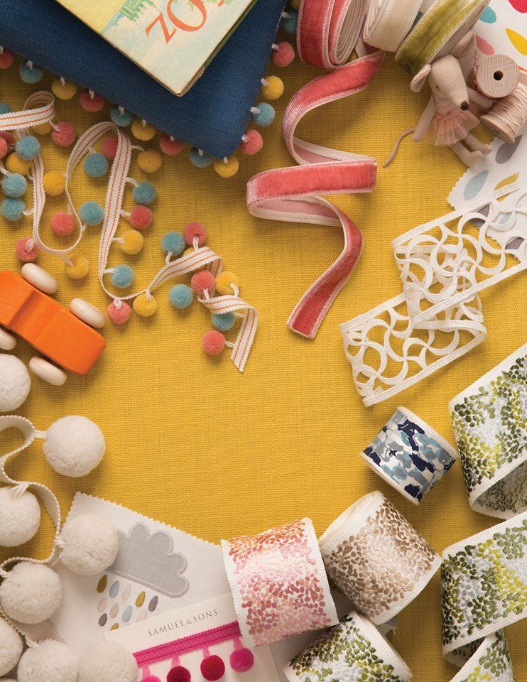 Chez Samuel & Sons l’élégance les passementeries Anglaises, de la collection « Cirque » charmantes de franges et de multitudes de pompons bordés de soie brodée…