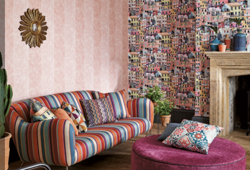 Au sous-sol de l’hôtel le Bel-Ami, l’éditeur Osborne & Little nous accueille autour d’un petit déjeuner, et présente une collection inspirée de l’histoire de l’art de Venise, avec des motifs très présents fleurs, formes géométriques sur des velours et voilages, le tout coordonné avec les papiers peints aux couleurs de la Riviera.