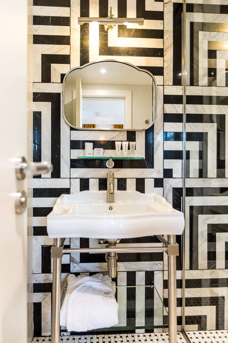 Evidemment, je ne pouvais que succomber à la découverte du charme de cet hôtel ! Dès l’extérieur, les grandes baies vitrées nous invitent à vouloir en savoir plus ! Au premier regard, c’est la couleur qui m’interpelle ! La couleur bleu canard très d’actualité avec un subtil mélange de jaune, noir et doré donnent le ton de l’espace accueil-réception. Toute la décoration a été pensée comme dans l’intérieur d’une maison privée. J’aime l’agencement du salon : des banquettes confortables avec en face de jolis fauteuils et poufs qui permettent de converser facilement avec les convives ! Le coin bibliothèque on l’on peut s’isoler pour lire un bon livre sélectionné par Elodie ! Le bar revêtu de marbre s’associe très bien avec le graphisme du parquet, les chaises hautes couleur laiton revêtues d’un beau velours apportent un équilibre avec l’espace cocktail subtilement mis en lumière. Un coup de cœur pour le bleu canard du plafond qui permet de mettre en valeur la corniche, j’adore !